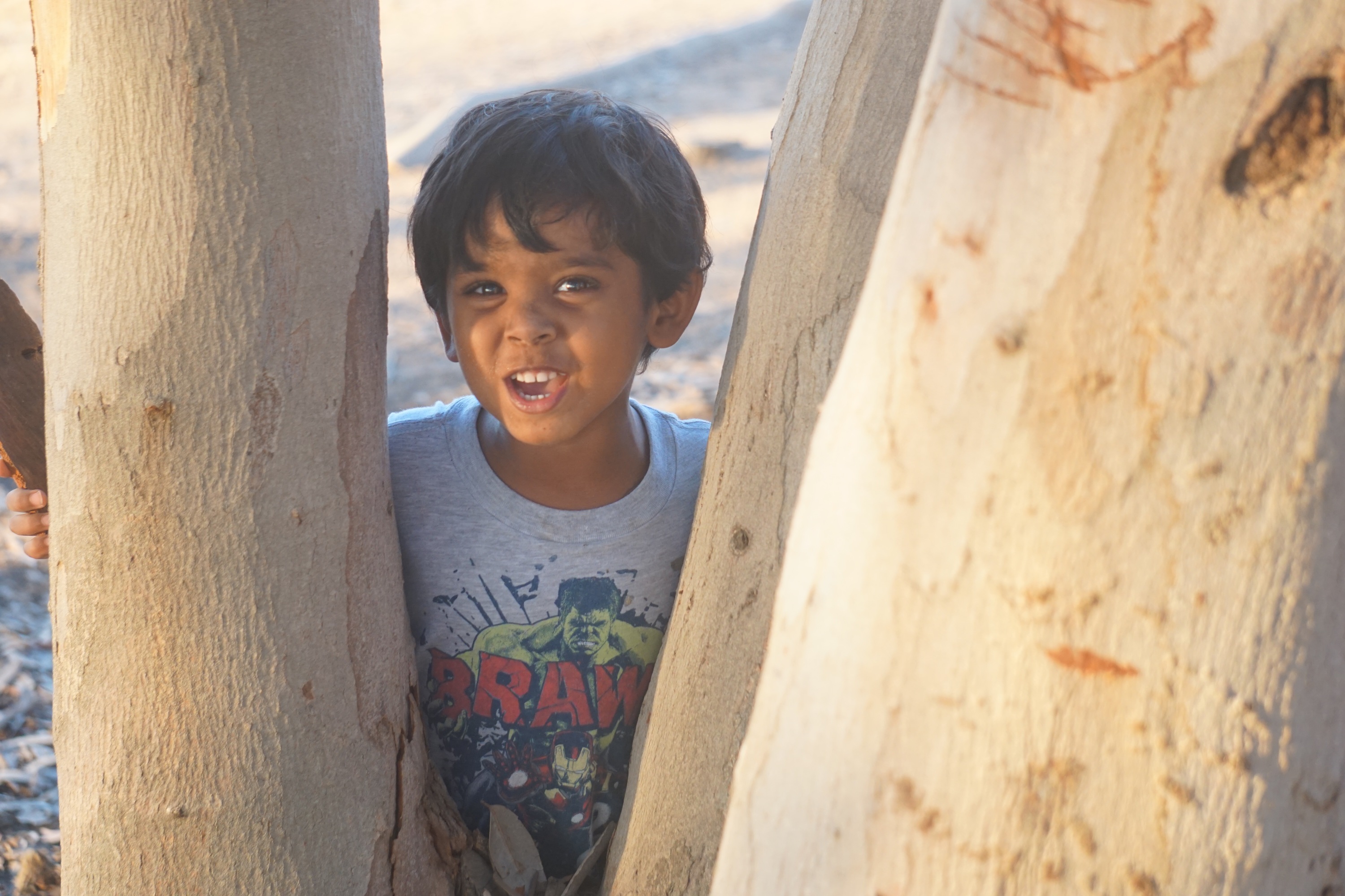 Just look at those 15th percentile chubby cheeks! For those wanting to report us, the can is empty and no he didn’t get tetanus from it! Atleast he didn’t cry as much when we took it awy from him as he did with his yellow tennis ball!The minute Arvind is close to nature, the first thing he does is find a stick…not just one stick but as many as his little hands can carry! Then he will proceed to draw nonsensical designs in the sand. He also decided to make a bow and arrow and defeat Taataka, Kamsa, Voldemore, Shredder, Beebob, Rocksteady, Putana and all other evil doers he could think of!Peekaboo! Arvind is really into superheroes at the moment…but he’s also into super villians as he probably would prefer to emulate the ‘bad guys’ more. He really likes the Incredible Hulk and Captain America and today he got new super hero underwear.